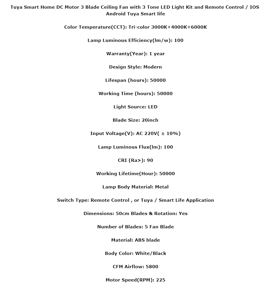 Tuya Smart Fan DC Motor 3 Blade Ceiling Fan with 3 Tone LED Light Kit and Remote Control / IOS Android Tuya Smartlife